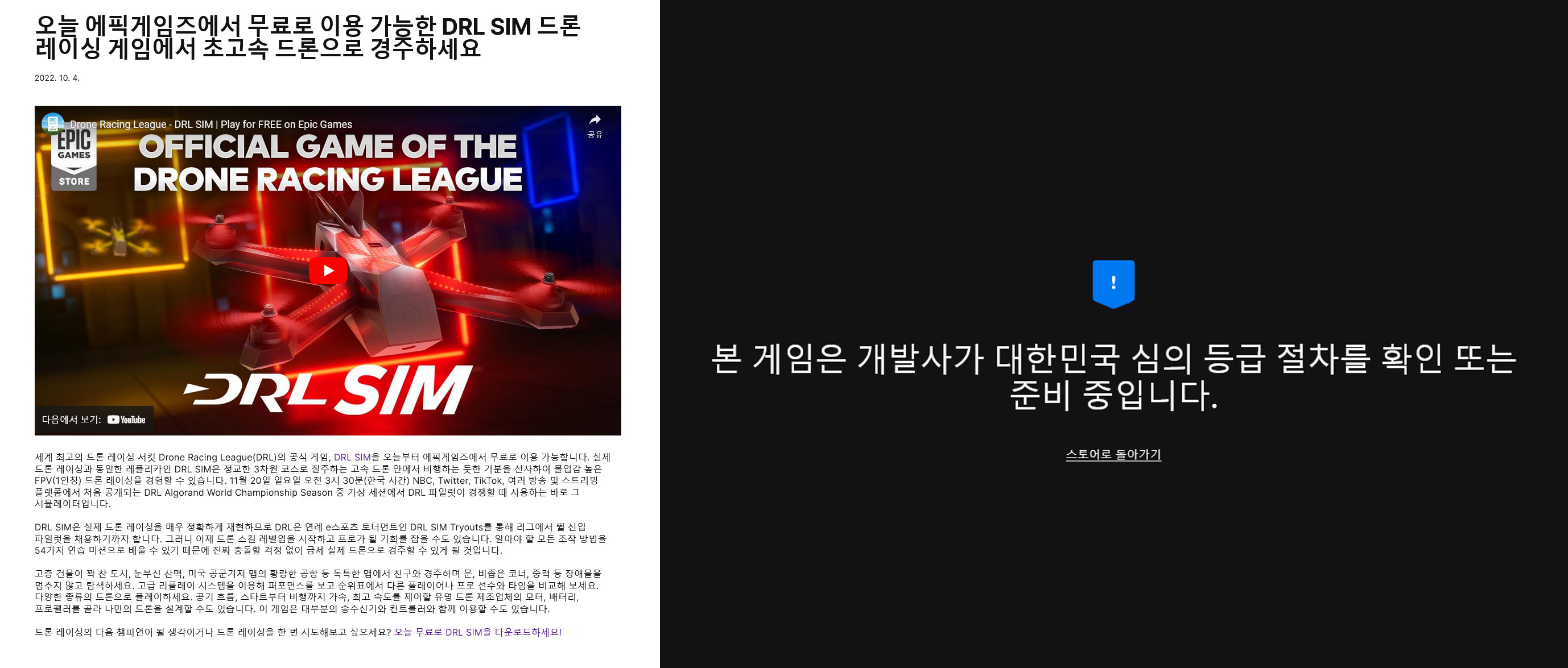 * 배포일에 런보우만 표기되고 있다. 결국 드론 레이싱 리그 시뮬은 국내 배포 안됨.