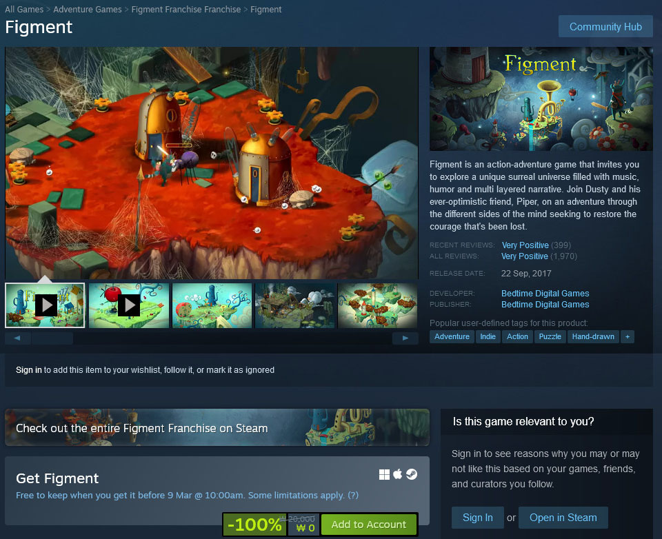 초현실적인 세계를 탐험하는 액션 퍼즐 게임 피그먼트(Figment)가 GOG와 스팀에서 무료 배포 중입니다.