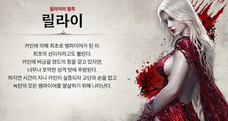 이후 카인은 광야에서 벗어나 처음 만난 강인한 여인 '릴라이'를 뱀파이어로 만들고, 자신의 모든 권능을 부여해 첫 번째 혈족이자 선지자를 만들어내죠.