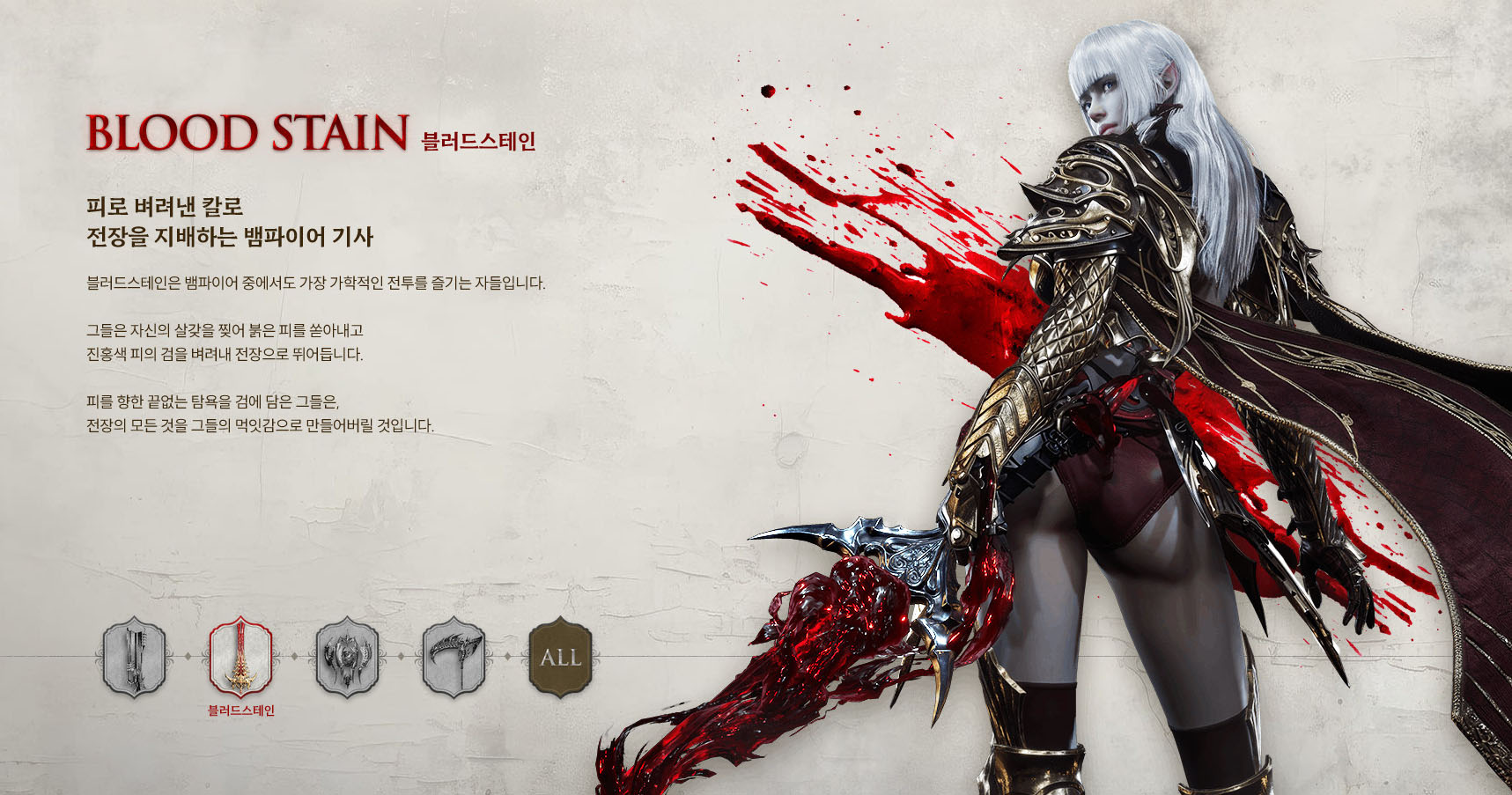 블러드 스테인 (피의 검) : 검을 쓰는 광전사지만, 방어적 성향과 딜러 포지션을 결합한 하이브리트 클래스입니다.