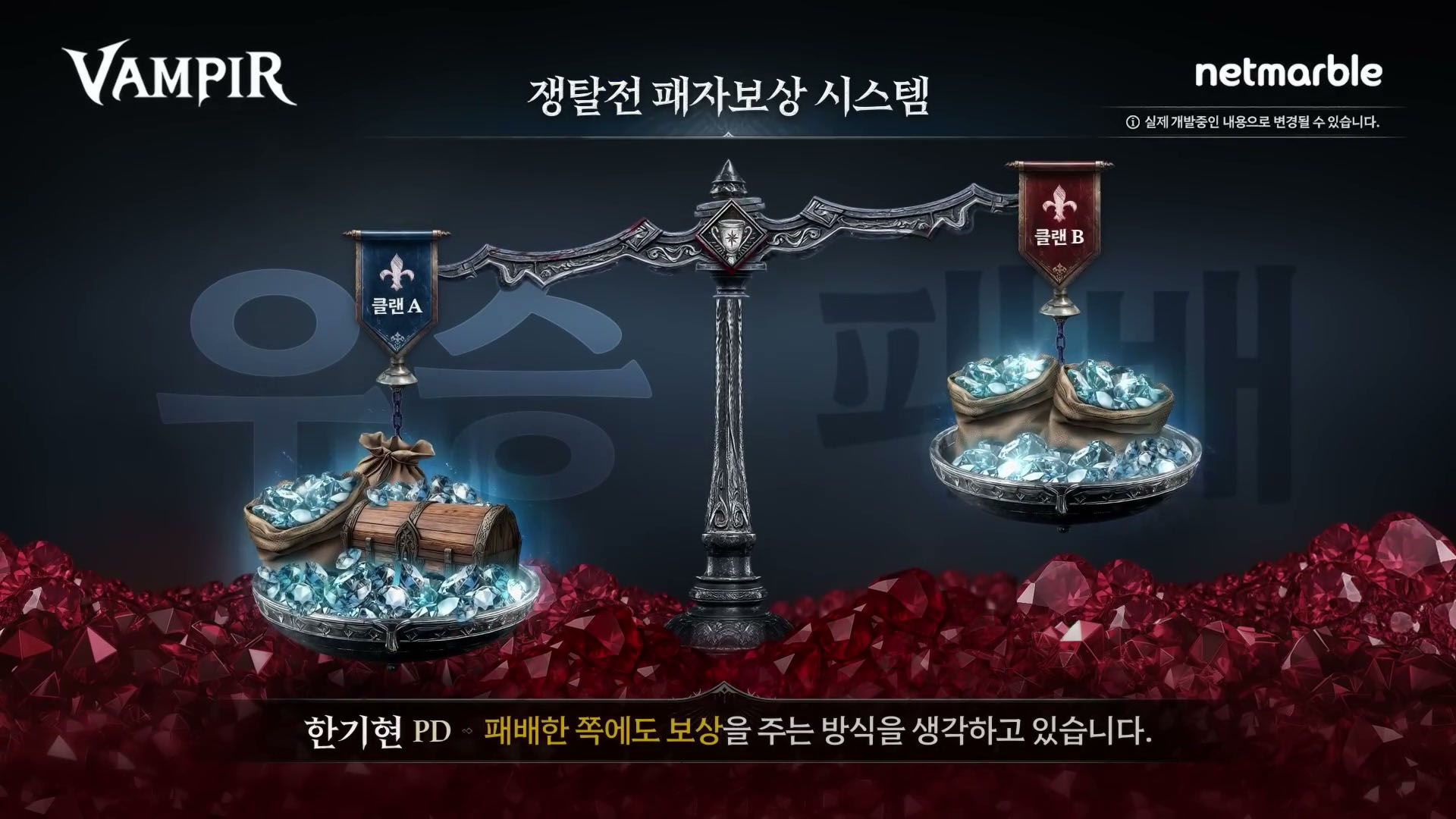 쟁탈전에서 승리한 클랜은 특별한 보상(패팅 금지권이나 성징적인 고등급 장비 '피의 군주 계승무기' 같은 것)을 얻게 됩니다. 다만, 격차가 너무 큰 경우 발생하는 박탈감, 노쇼 등 문제를 완화하기 위해 패배한 클랜에게도 일정 비율의 보상을 주도록 할 예정이라는군요.