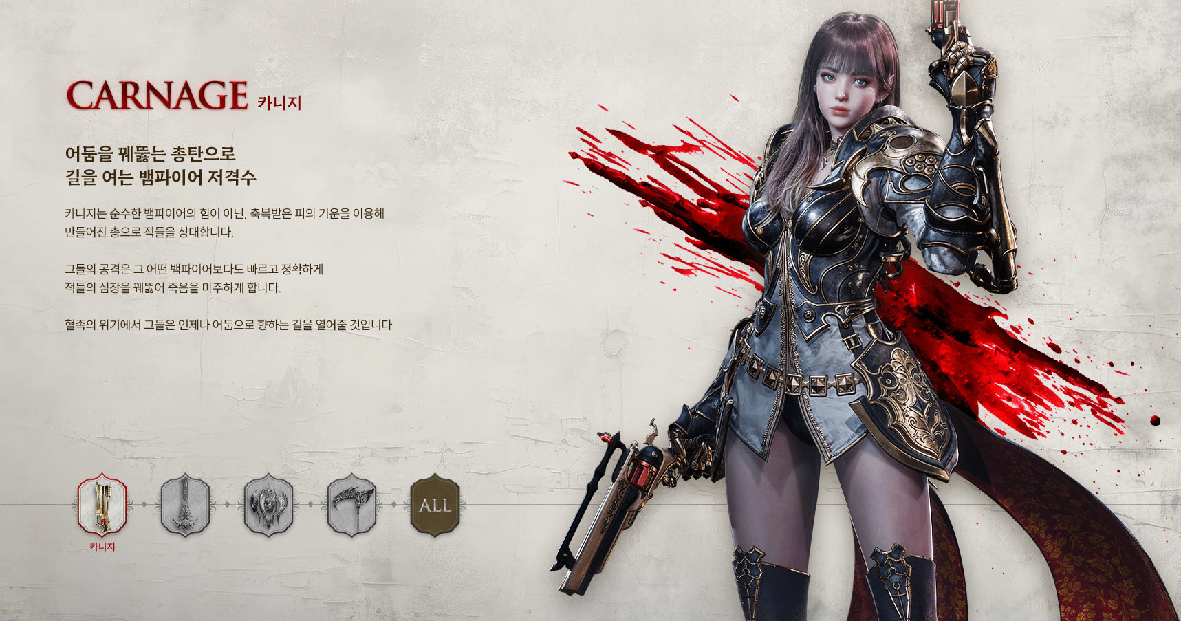 전부 매력적인 무기를 사용하는데, 개인적으로는 정식 출시가 되면, 카니지와 그림리퍼를 아마 먼저 선택하지 않을까 합니다. 블러드 스테인과 바이퍼도 매력적인 스킬들이라 기대되는 건 마찬가지.