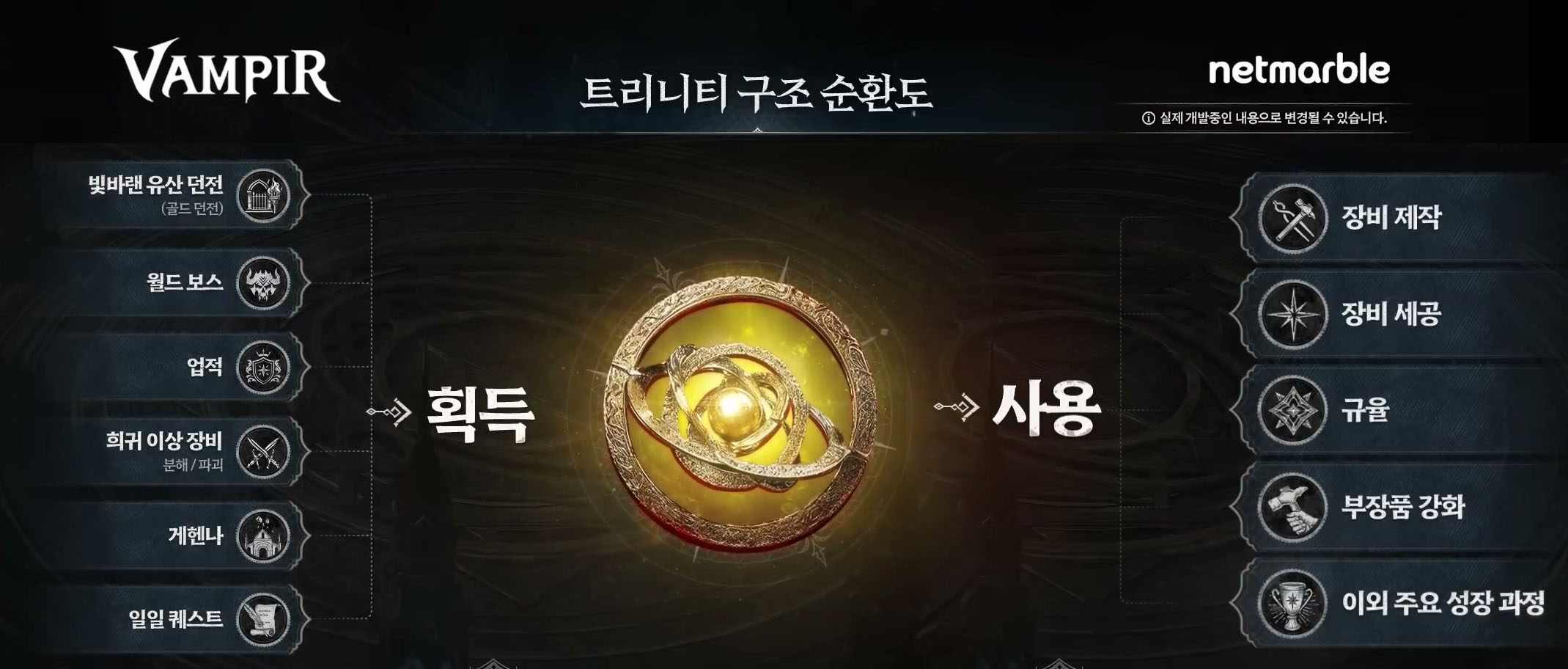 게임 내 주요 재화는 트리니티로 장비 제작, 강화, 세공 등 핵심 성장 시스템에서 사용됩니다. 재화 종류를 단순화하면서 재화의 가치를 보존하는데 중점을 두는 방식으로 구성 중.