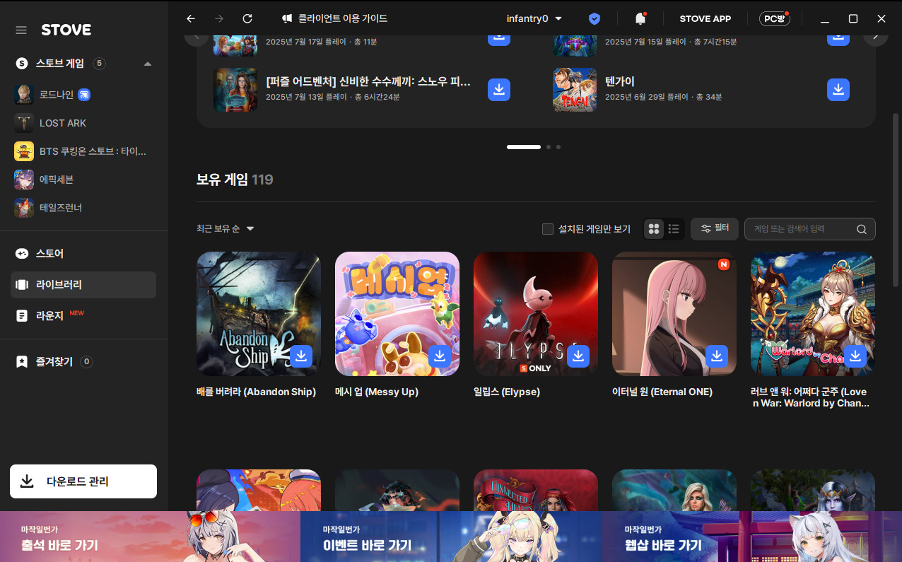 스토브가 거의 1~2주 단위로 주간 행사 / 이벤트를 자주하고, 매주 수요일과 목요일에는 '빅딜'까지 겸하면서 일단 입점 게임 중 가용 게임은 신작을 제외하면 라이브러리에 꾹꾹 눌러 담아 퍼주는 중이라고 할 수 있거든요.