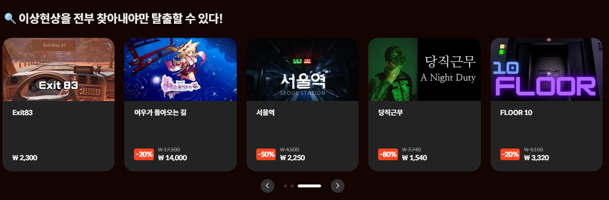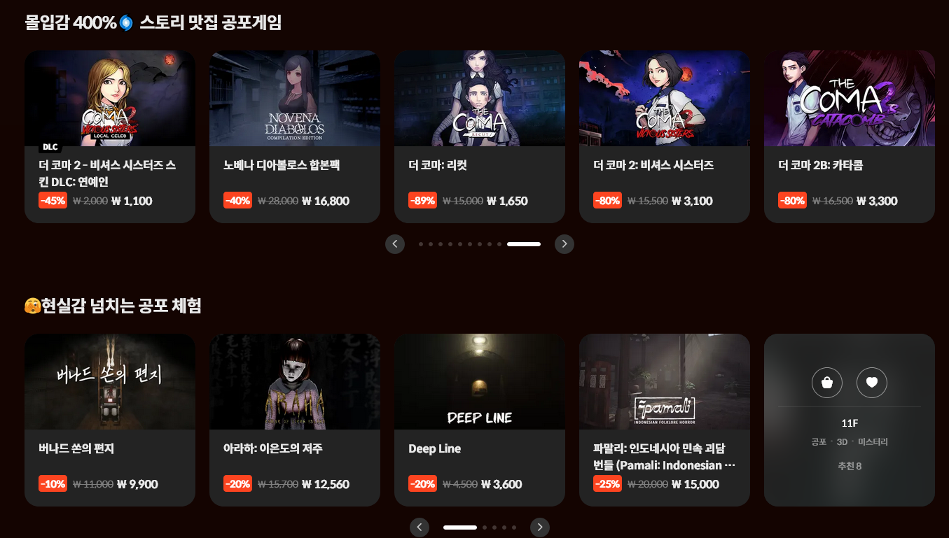 진짜 공포와 스릴러 타이틀을 대상으로 진행 중인 할인 행사. 주로 인디 게임이자 한글화 된 작품이 많아서 스팀과는 차별화라고 해야 할까? 스토브 자신의 장점을 찾아가는 모습입니다.