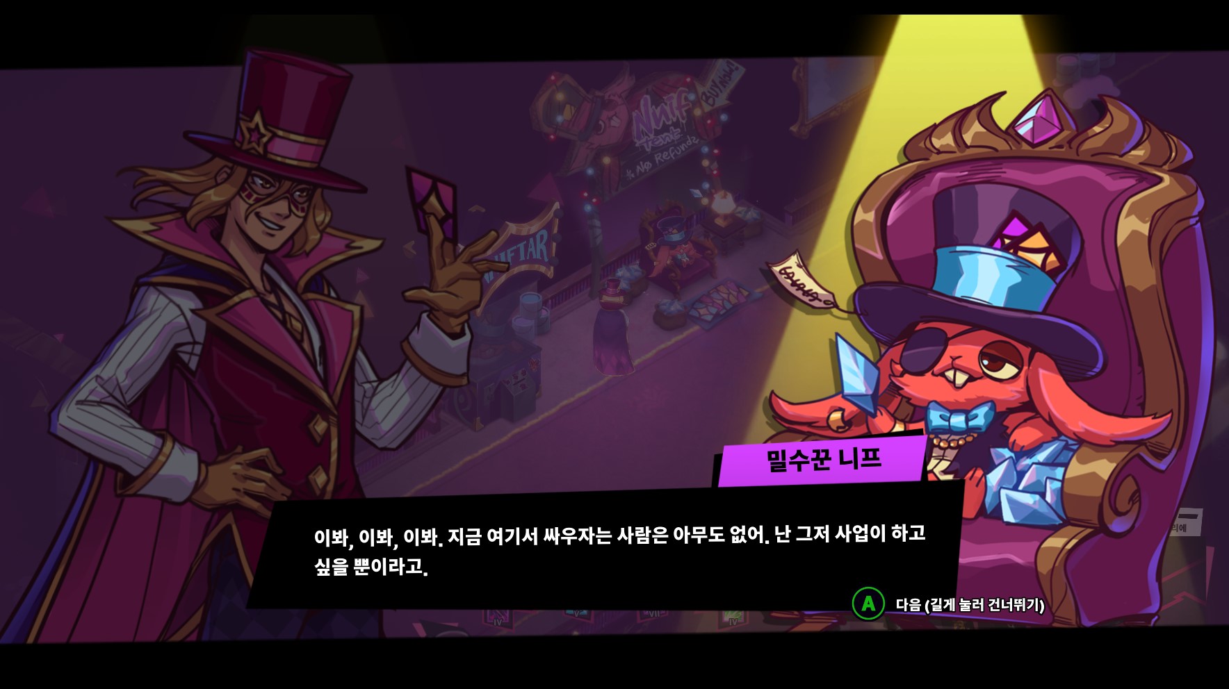 보스전을 마치면 만날 수 있는 밀수꾼 니프는 니프-타르(업그레이드 상점 시스템)와 시작 카드 티어 업 같은 특수 해금 기능을 제공한다.