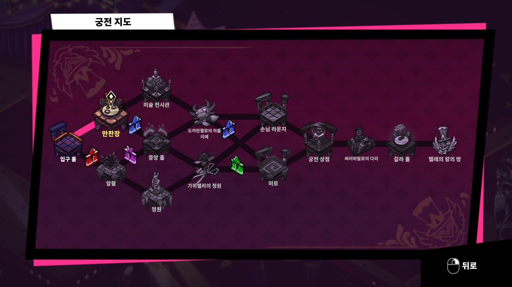렐레가 만든 거울 세계의 궁전은 여러 지역으로 나뉘며, '도끼란젤로의 아틀리에'와 '가위렐라의 정원' 중 하나를 거치게 된다. 열쇠를 얻고 나면 조금 자유롭게 루트를 선택할 수 있지만, 보스를 피하는 건 불가능.
