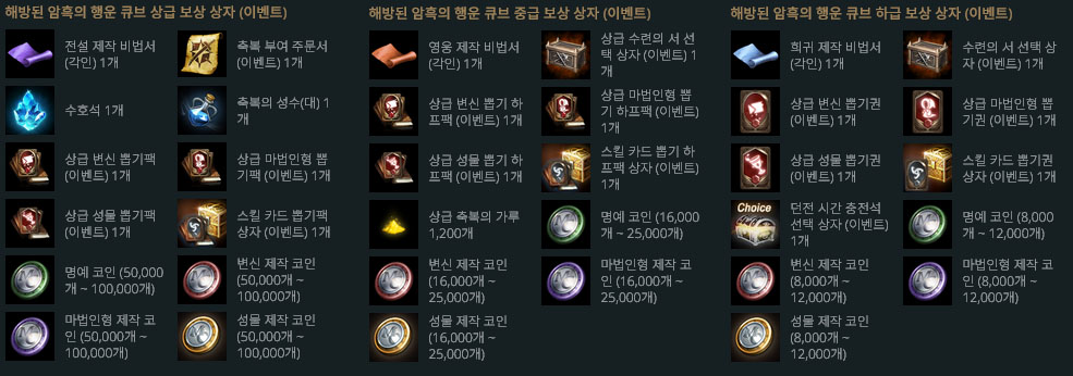 해방된 암흑의 행운 큐브는 확률적으로 상/중/하급 보상 상자 중 하나가 나옵니다. 다 주는 게 아닙니다.