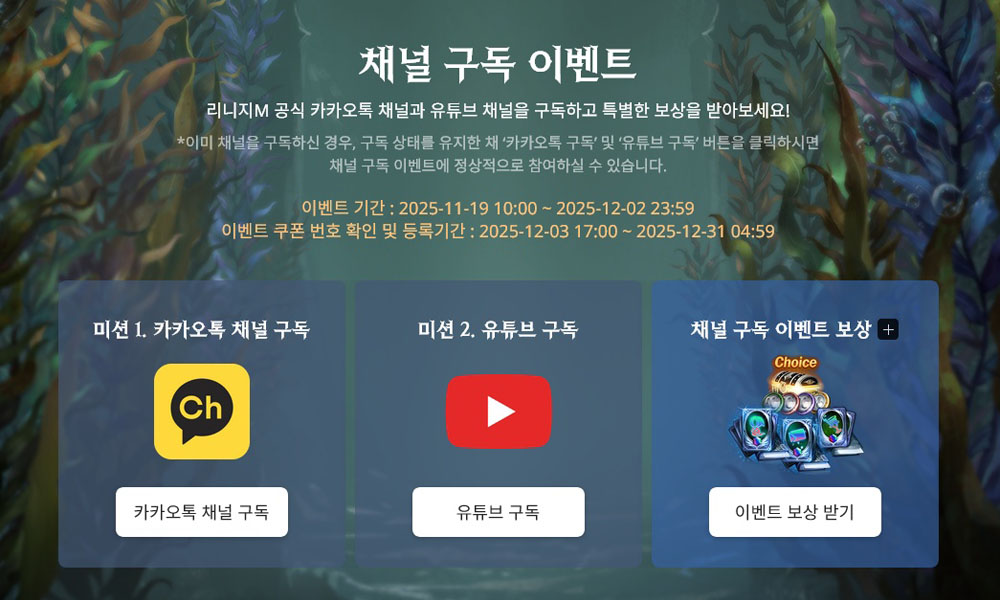 카카오톡 채널 구독과 유튜브 구독을 완료하면 12월 3일부터 31일 새벽 5시까지 '신비한 변신 / 마법인형 / 성물 뽑기 팩 각 1개, 종합 코인 선택 상자 2개'를 보상으로 주는 쿠폰을 얻을 수 있습니다. 지금 받는 게 아닙니다. 12월 3일 오후 5시 이후예요.