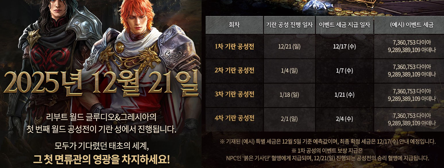 12월 21일에는 리부트 월드 글루디오, 그레시아에서 월드 공성전이 진행된다고 합니다. 직접 참여하지 못해도 게임을 방송이나 라이브로 보는 것도 새로운 재미이므로 관심 있는 분은 당일 관련 라이브를 한번 찾아보시길 바랍니다.