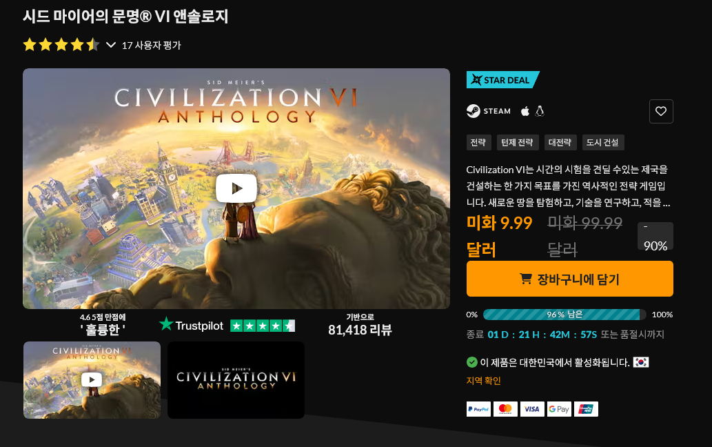 ** 험블번들이 삽질하거나 애매한 번들을 줄 때, 핵심 게임만 파는 파나티컬에서 이번에 문명6 앤솔로지만 따로 스타딜로 내놓는 중. 짧은 이틀 단위로 28일 새벽1시까지. 10달러 정도라 가성비는 험블이 좋으나 앤솔로지 하나만 원할 때 생각해볼만한 카드. (파나티컬용 고유 쿠폰이 있지만, 스타딜은 아마 사용 불가가 아닐까 싶다.)
