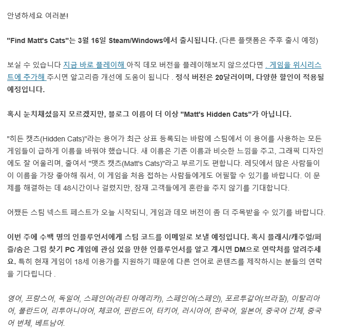 스팀(Valve) 측 통보 메일 번역보낸 이: Steam (Valve) 수신 이: [각 인디 개발사]안녕하세요, 당사는 Nukearts Studio의 상표권 소유자인 **[편집됨]**으로부터 귀하의 게임들에 대한 상표권 침해 신고를 접수했습니다. **[편집됨]**은 귀하의 게임 제목들이 자신들의 지식재산권(IP)인 **"HIDDEN CATS"**를 침해한다고 주장하고 있습니다. 관련 상표권 등록 정보는 아래 링크에서 확인하실 수 있습니다: (USPTO 및 WIPO 상표권 조회 링크) 또한, 누크아츠는 최소 2022년부터 스팀에서 HIDDEN CATS라는 명칭을 지속적으로 사용해 왔습니다. 귀하의 게임이 귀하에게 얼마나 소중한지 잘 알고 있습니다. 따라서 귀하가 침해 요소가 있는 제목들을 **2026년 3월 2일(영업일 종료 시까지)**까지 변경해 주실 것을 요청합니다. *[추가 주의 사항] *아래의 게임은 이번 상표권 신고 대상에는 직접 포함되지 않았습니다. 하지만 당사는 [편집됨]의 IP를 침해하는 모든 타이틀을 변경할 수 있도록 유예 기간을 드리고자 합니다. 향후 해당 게임에 대해 추가적인 상표권 신고가 접수될 경우, **유예 기간 없이 상점에서 즉시 퇴출(Retire)**해야 할 수도 있음을 유의하시기 바랍니다. 새로운 제목에는 'HIDDEN'과 'CATS'가 동시에 포함되어서는 안 됩니다. 'HIDDEN'이나 'CATS' 중 하나만 사용하는 것은 가능합니다. 게임 이름 수정 프로세스에 대한 자세한 정보는 다음 링크를 참조하십시오: [스팀 파트너 링크] 이 이메일의 끝에 신고서 원본을 첨부하였습니다. IP 사용과 관련한 문의 사항은 **[편집됨]**에게 직접 연락하시기 바랍니다. 저는 2026년 3월 2일에 귀하의 게임들을 다시 확인하겠습니다. 참고로 저는 2/22부터 2/28까지 자리에 없을 예정이므로, 이 기간에 보내주신 답장은 3월 2일에 확인될 것입니다. 감사합니다. |