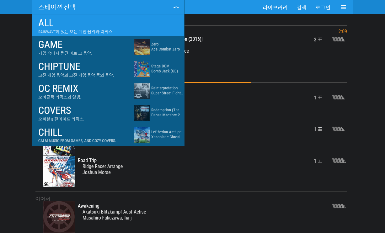 게임 외에 칩듄(Chiptune), 오버클럭 리믹스(OC Remix-게임 원곡을 다양한 장르로 편곡), 커버(Covers-공식 또는 팬메이드 리믹스), 칠아웃(Chill-다운템포) 등을 지원한다.