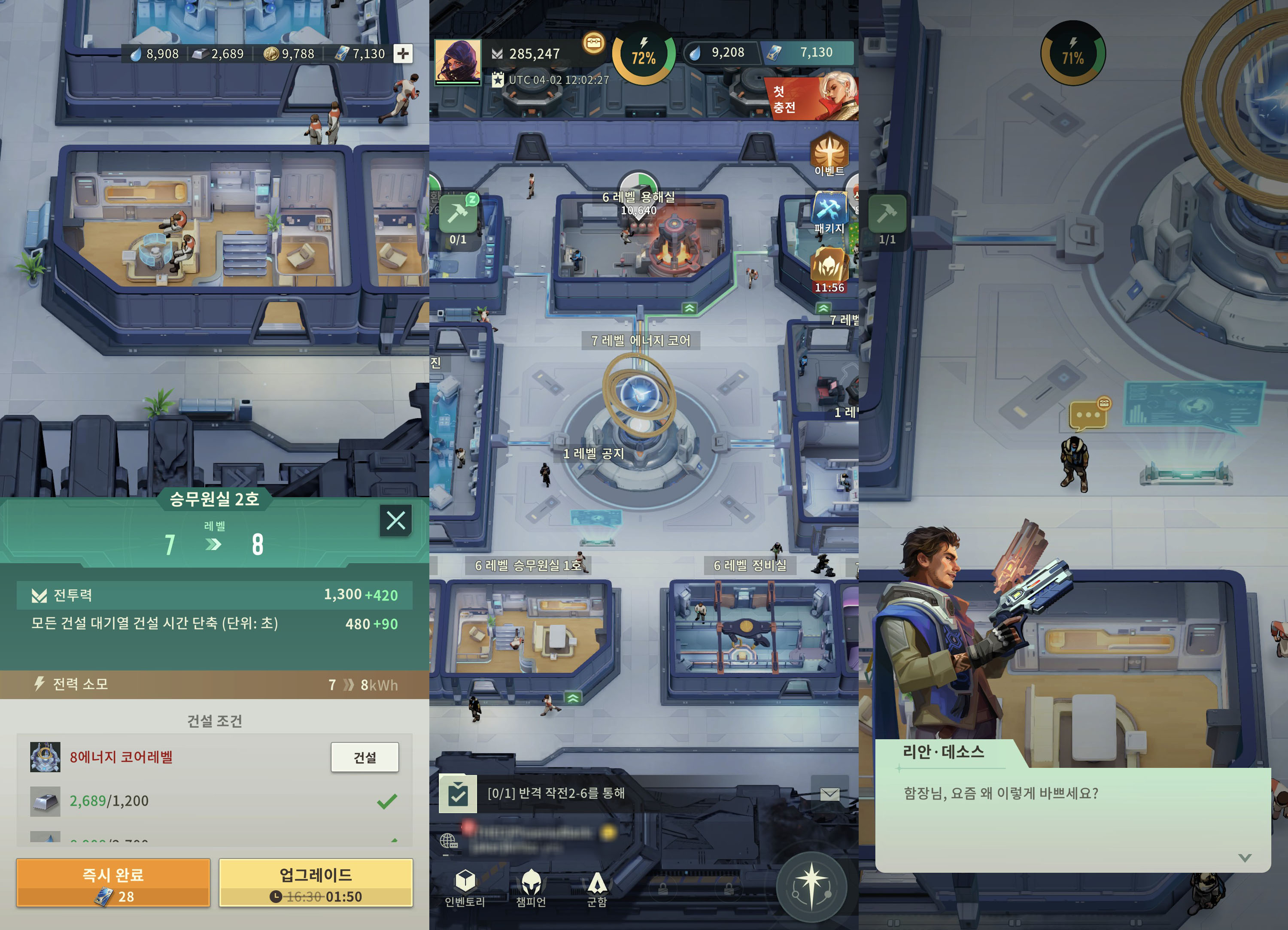 튜토리얼 겸 도입부 스토리에서 보여주는 해적의 습격으로 파괴된 함선 내부를 복구하는 전개는 기존 SLG와 유사한 방식입니다. 하지만, 단순히 거대한 성이나 영지의 한 귀퉁이의 불을 끄거나 아이콘을 수리하는 게 아닌 세밀한 우주선 내부 표현과 동료들과의 상호작용 표현은 반드시 복구해야 한다는 절박감이 훨씬 매력적이고 현실감 있게 다가옵니다.